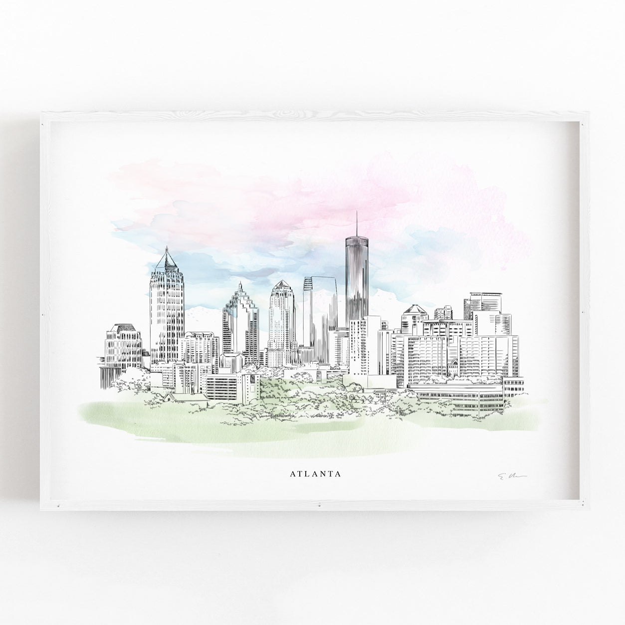 This beautiful hand-drawn Renaissance-style pen and ink artwork captures the iconic Atlanta Skyline. A perfect blend of ink and watercolor, reproduced on our signature watercolor paper imported from Italy. This piece evokes a classical style developed during the high renaissance period in history. Each print comes complete with a white matte and backing - ready for easy framing using archival inks. Every art print is signed by the artist.