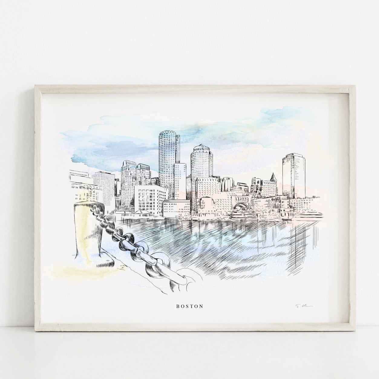 This beautiful hand-drawn Renaissance-style pen and ink artwork captures the iconic city of the Boston skyline. A perfect blend of ink and watercolor, reproduced on our signature watercolor paper imported from Italy. This piece evokes a classical style developed during the high renaissance period in history. Each print comes complete with a white matte and backing - ready for easy framing using archival inks. Every art print is signed by the artist.