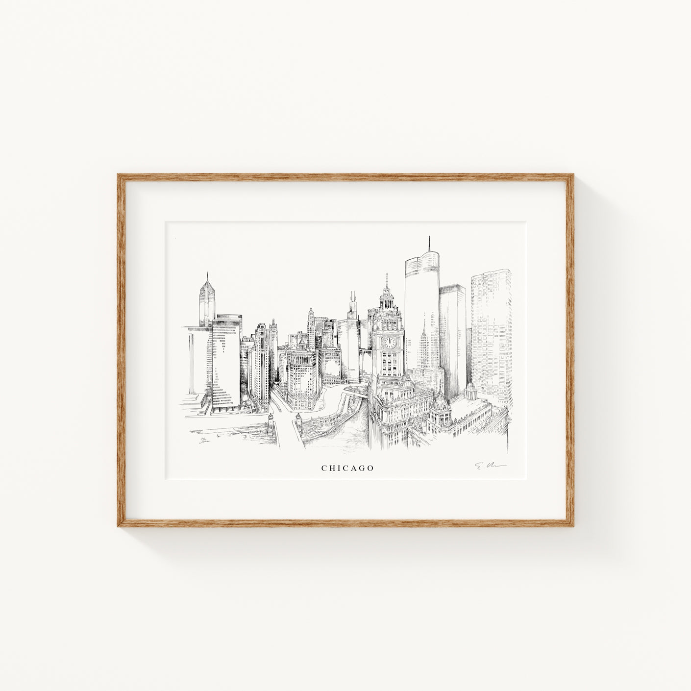 This beautiful hand-drawn Renaissance-style pen and ink artwork captures the iconic Chicago Skyline. A perfect pen & ink drawing reproduced on our signature watercolor paper imported from Italy. This piece evokes a classical style developed during the high renaissance period in history. Each print comes complete with a white matte and backing - ready for easy framing using archival inks. Every art print is signed by the artist.