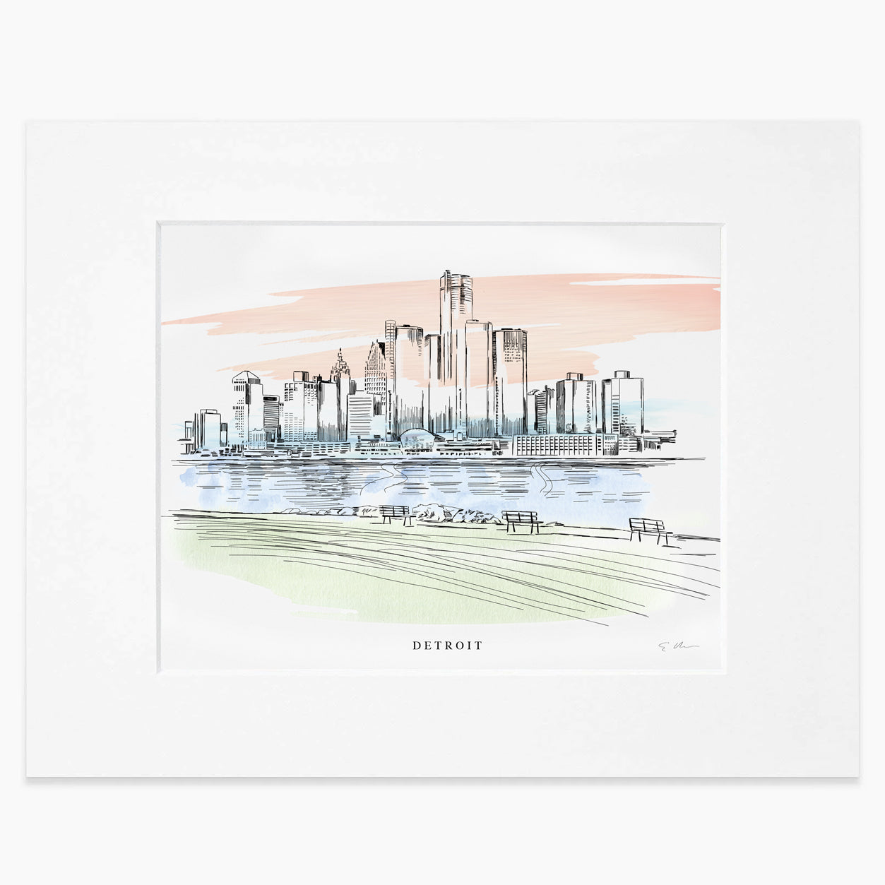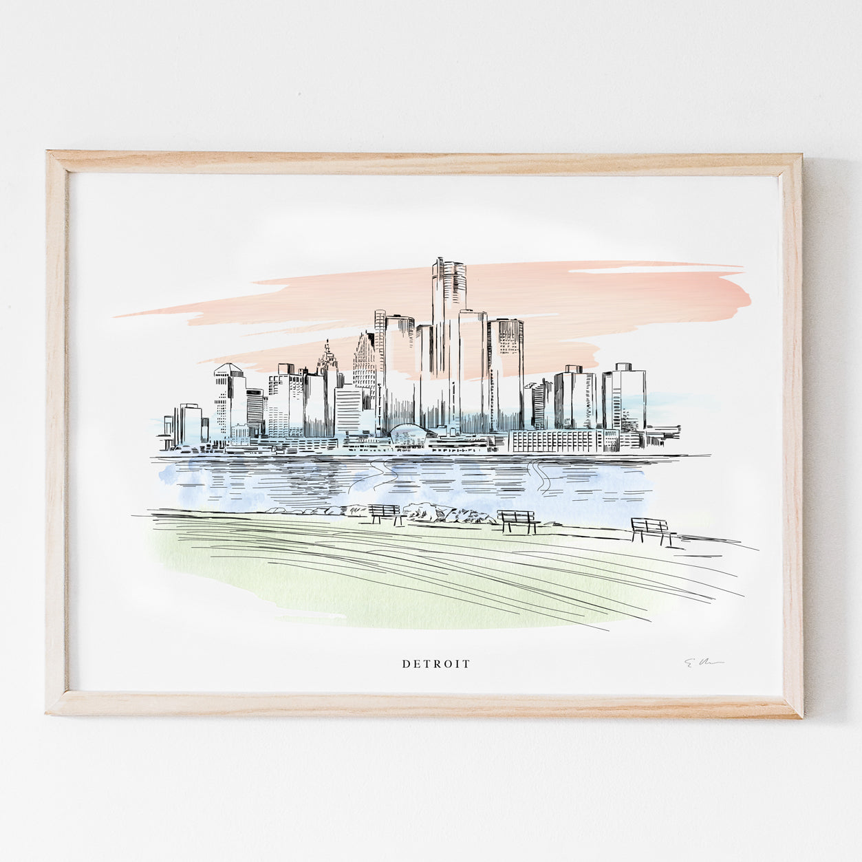 This beautiful hand-drawn Renaissance-style pen and ink artwork captures the iconic Detroit Skyline. A perfect blend of ink and watercolor, reproduced on our signature watercolor paper imported from Italy. This piece evokes a classical style developed during the high renaissance period in history. Each print comes complete with a white matte and backing - ready for easy framing using archival inks. Every art print is signed by the artist.