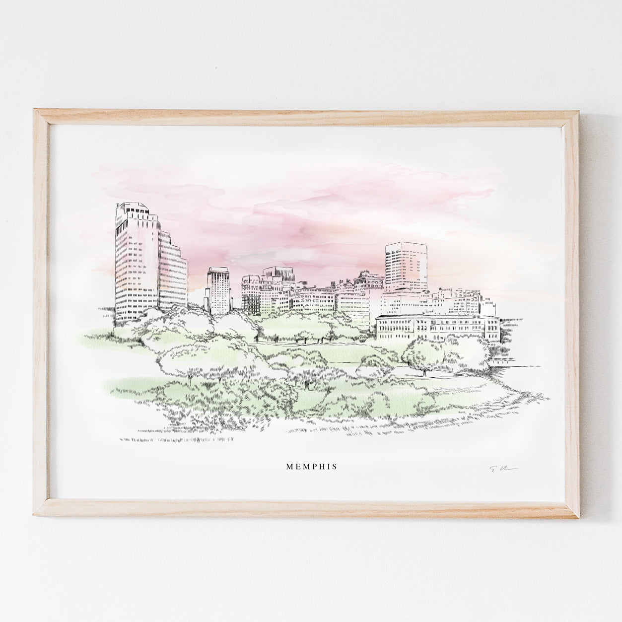 This beautiful hand-drawn Renaissance-style pen and ink artwork captures the iconic Memhis skyline. A perfect blend of ink and watercolor, reproduced on our signature watercolor paper imported from Italy. This piece evokes a classical style developed during the high renaissance period in history. Each print comes complete with a white matte and backing - ready for easy framing using archival inks. Every art print is signed by the artist.
