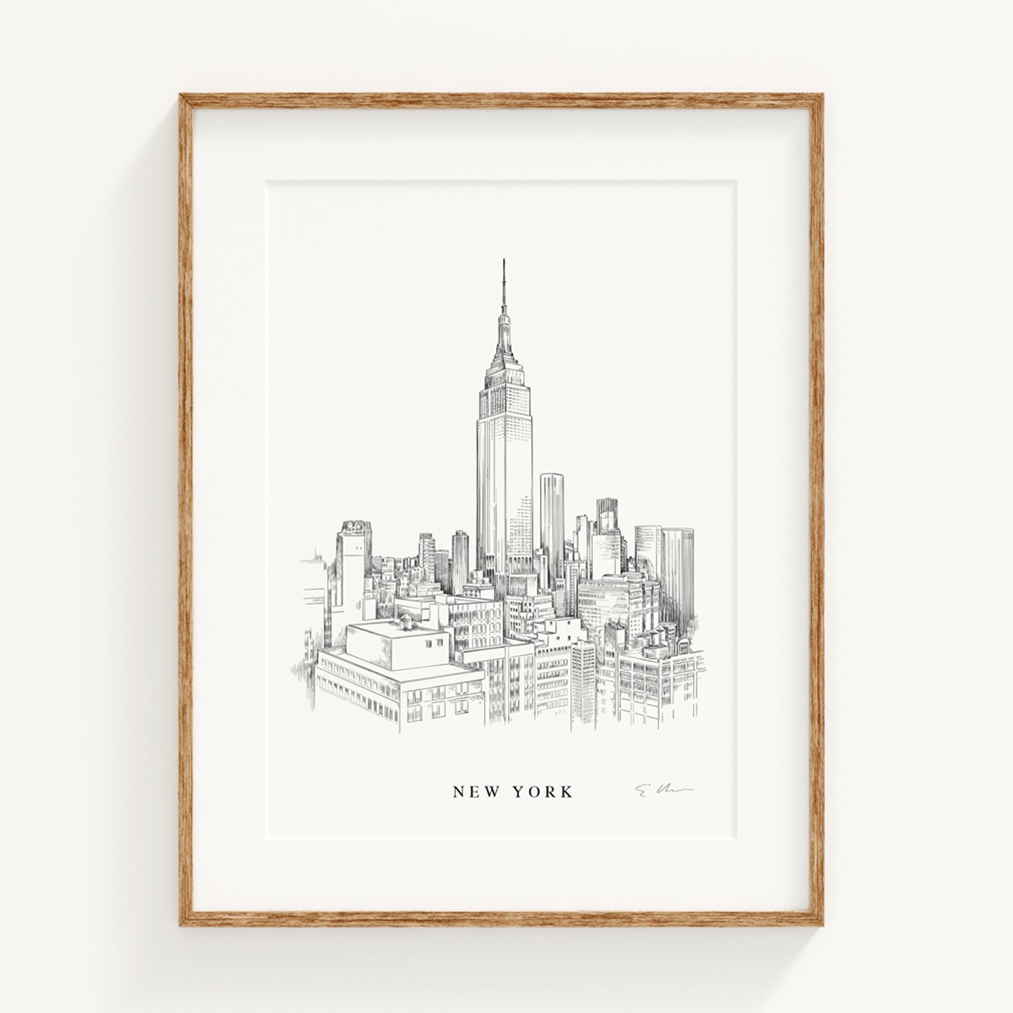This beautiful hand-drawn Renaissance-style pen and ink artwork captures the iconic NYC skyline. A perfect blend of ink, reproduced on our signature watercolor paper imported from Italy. This piece evokes a classical style developed during the high renaissance period in history. Each print comes complete with a white matte and backing - ready for easy framing using archival inks. Every art print is signed by the artist.