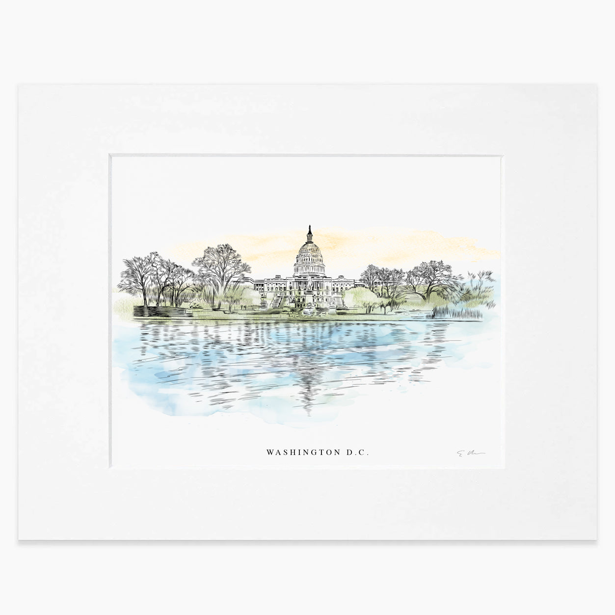 This beautiful hand-drawn Renaissance-style pen and ink artwork captures the iconic Washington DC Capital. A perfect blend of ink and watercolor, reproduced on our signature watercolor paper imported from Italy. This piece evokes a classical style developed during the high renaissance period in history. Each print comes complete with a white matte and backing - ready for easy framing using archival inks. Every art print is signed by the artist.