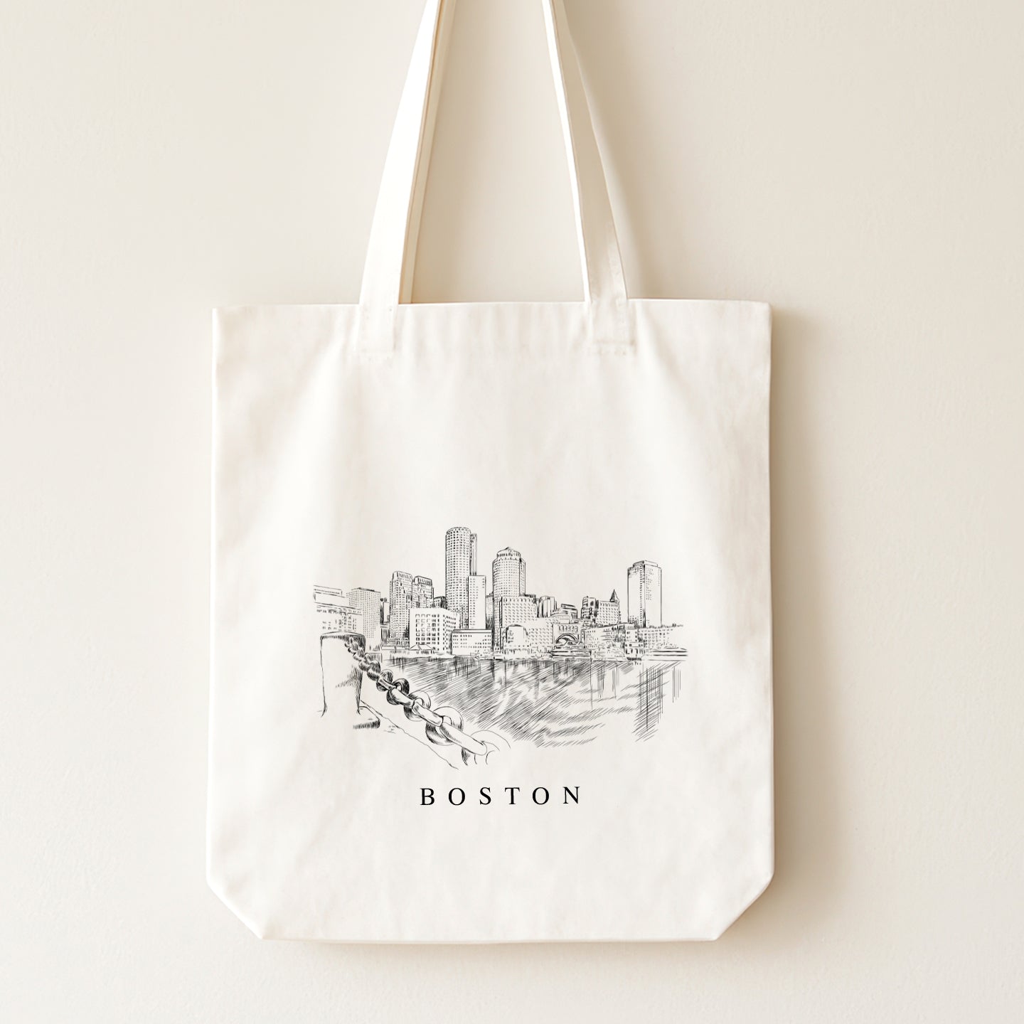 Our Boston Skyline Pen & Ink hand-drawn Renaissance Style tote bag is made from durable 100% certified organic cotton. The organic cotton self-fabric handles are reinforced with stress-point stitching for durability and to carry a heavy load. Our tote bags are perfect for a visit to the library, a day at the beach, or a trip to go grocery shopping.