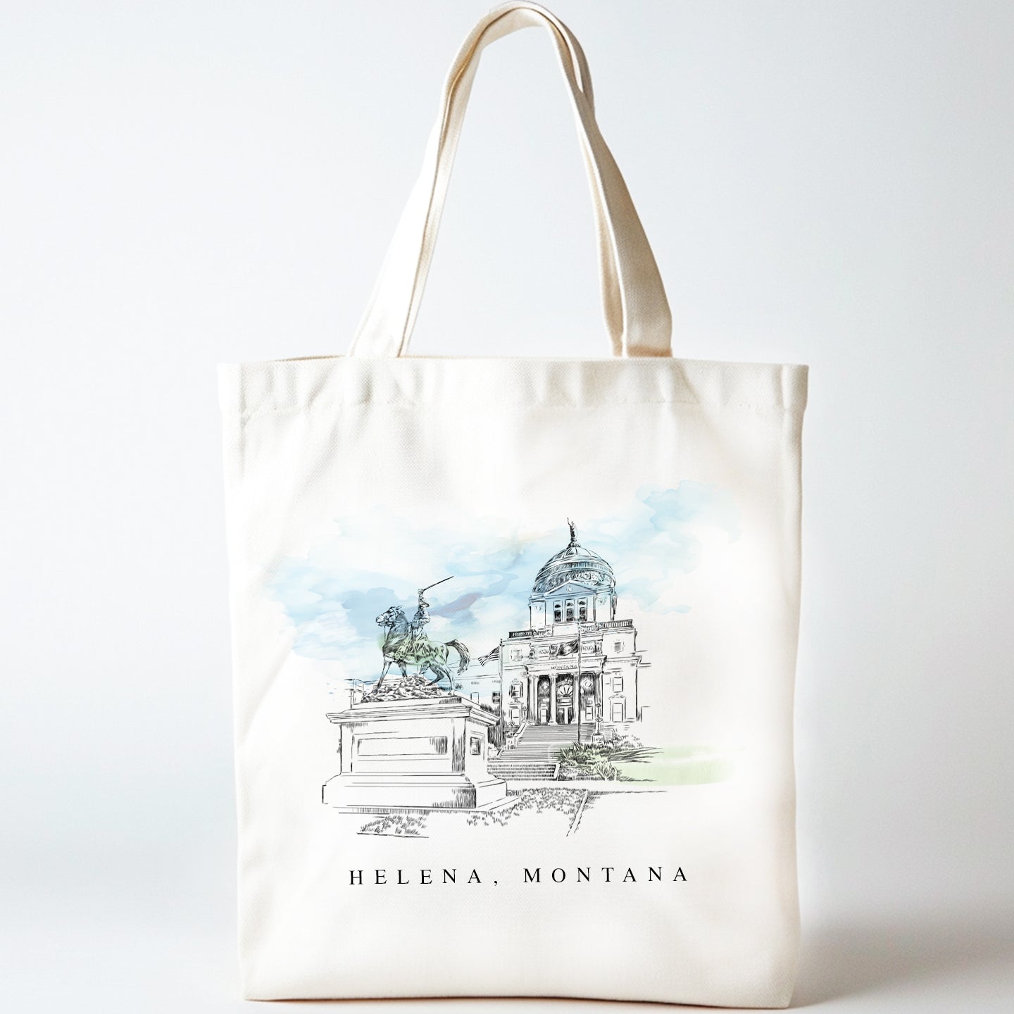 Our Helena, Montana Skyline Pen & Ink hand-drawn Renaissance Style tote bag is made from durable 100% certified organic cotton. The organic cotton self-fabric handles are reinforced with stress-point stitching for durability and to carry a heavy load. Our tote bags are perfect for a visit to the library, a day at the beach, or a trip to go grocery shopping.