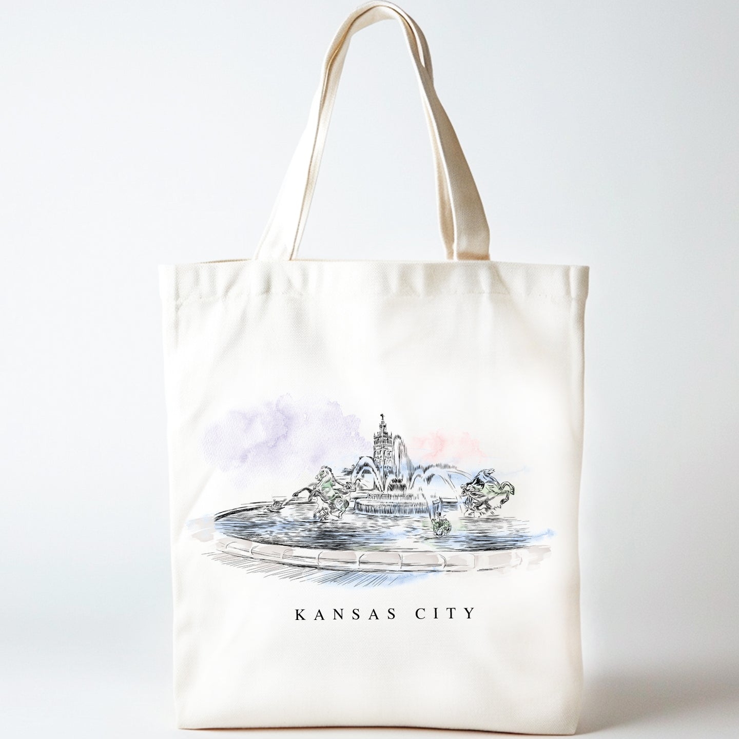 Our Kansas City Fountain Pen & Ink hand-drawn Renaissance Style tote bag is made from durable 100% certified organic cotton. The organic cotton self-fabric handles are reinforced with stress-point stitching for durability and to carry a heavy load. Our tote bags are perfect for a visit to the library, a day at the beach, or a trip to go grocery shopping.
