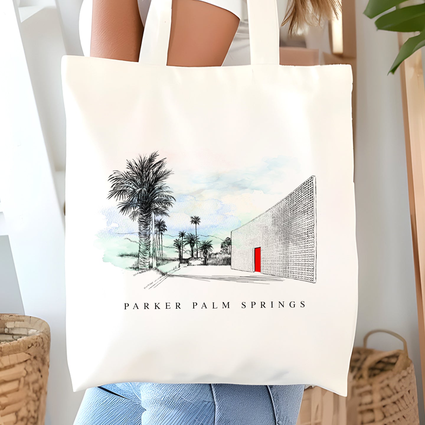 Our Parker Palm Springs Pen & Ink hand-drawn Renaissance Style tote bag is made from durable 100% certified organic cotton. The organic cotton self-fabric handles are reinforced with stress-point stitching for durability and to carry a heavy load. Our tote bags are perfect for a visit to the library, a day at the beach, or a trip to go grocery shopping.
