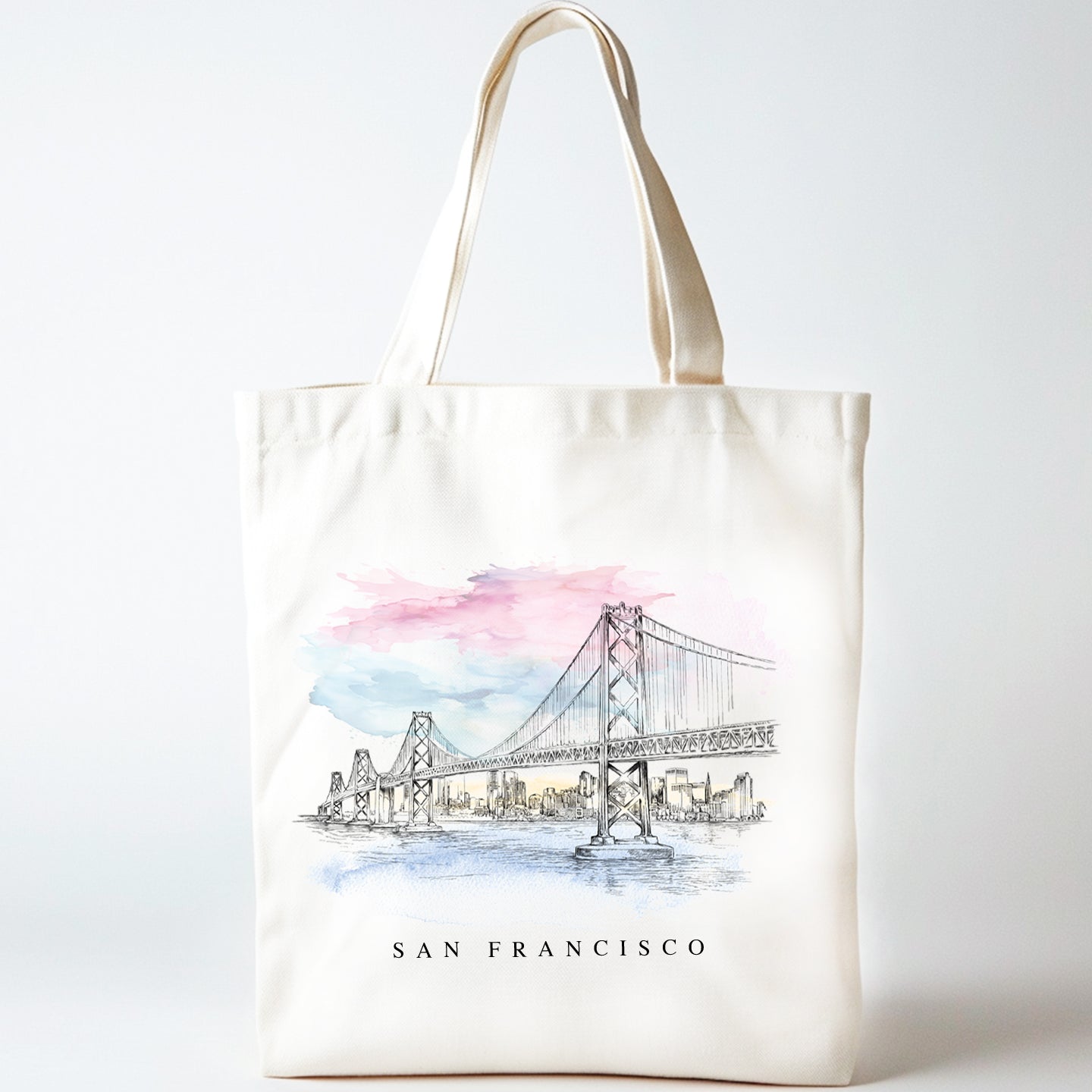 Our San Francisco Skyline Pen & Ink hand-drawn Renaissance Style tote bag is made from durable 100% certified organic cotton. The organic cotton self-fabric handles are reinforced with stress-point stitching for durability and to carry a heavy load. Our tote bags are perfect for a visit to the library, a day at the beach, or a trip to go grocery shopping.
